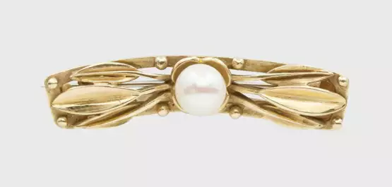 Gelbgold, 14 k. Plastisch gestaltete Blätter, mittig aufgesetzte weiße Perle von ca. 7 mm in farbintensivem, rosé-grün changierendem Lüster. Gew. ca. 8,05 g.