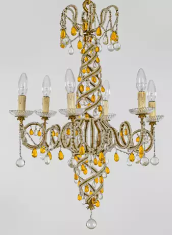 6-flg. Farbloses und bernsteinfarbenes Glas. Durchbrochen gestalteter Balusterschaft aus gedrehten Streben. Davon ausgehend stark geschwungene Leuchterarme mit gemuldeten Traifschalen. Behang aus Tropfen. Elektriufiziert. H. 72 cm. D. 52 cm.