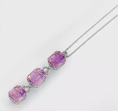 Weißgold, gest. 750. Schauseitig besetzt mit 3 pinkfarbenen Kunziten im oktogonalem Schliff von zus. ca. 37,95 ct., unterteilt durch kleine Diamantreifen, an feiner Erbsenkette. Ges.-Gew. ca. 15,74 g.