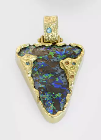 Pendant set with a matrix opal and small tourmalines, in 18 k gold. Maker's mark.
