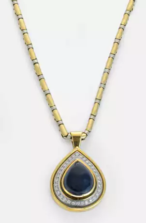 Necklace set with an ink blue sapphire cabochon and diamonds approx. 0,60 ct., in 18 k white and yellow gold.