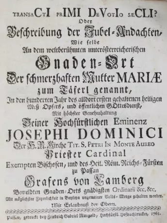 VD 18, 14402084-003. Seltene einzige Ausgabe. - Seltene Schrift in 14 Predigten zum 100-jährigen Jubiläum der ersten Messe in der ╔Wallfahrtskirche Maria Taferl╗, in der gleichnamigen Marktgemeinde im Bezirk Melk, Niederösterreich. Maria Taferl gilt nach Mariazell als der bedeutendste Wallfahrtsort Niederösterreichs. - Etw. gebräunt, tls. stockfleckig. Vors. mit Wurmspur im Bug.