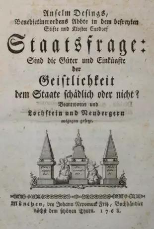 Erste dt. Ausgabe. Zum Verf. vgl. ADB V, 73 f. Erschien bereits 1753 in Stadtamhof unter dem lateinischen Titel "Opes sacerdotii num reipublicae noxiae? Ex rerum natura, sana politica et communi sensu generis humani examinatum". - Provenienz: Adelsbibliothek.