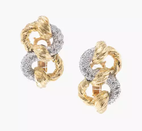 750 Weiss-/Gelbgold. Als doppeltes Kettenglied stilisierte bicolore Ohrclips im Wechsel mit Brillant-Pavé und strukturierter Oberfläche. L 3 cm, 32 g.