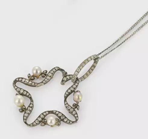 Silber, gest. 835. Geschwungener Anhänger besetzt mit 4 silberfarbenen Perlen von ca. 4 mm, in sehr farbintensivem, rosé-grün changierendem Lüster und Diamantrosen, an feiner Panzerkette. L. ca. 50 cm. Gew. ca. 7,21 g.