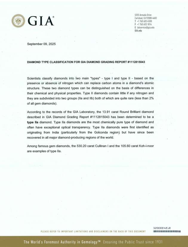 GIA, 2025, report no. 1112815043: 13.91 carats, D colour, VVS2 clarity, excellent cut, polish and symmetry, Type IIa