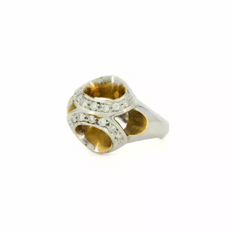 Description: Hollow geometric ring with diamonds in a bezel setting. Round elements are partially