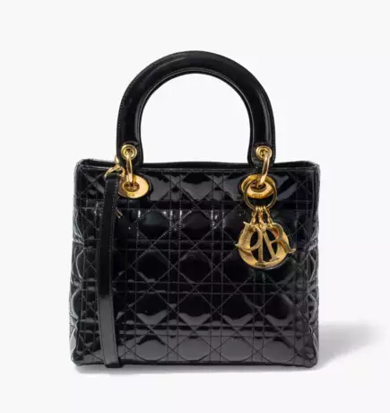 Aus schwarzem Lackleder mit Cannage Motiv. Goldfarbene Metallbeschläge. D.I.O.R. Metallanhänger mit Gold-Finish. Zwei abgerundete Tragegriffe. Reissverschluss. Abnehmbarer Schulterriemen. 24x20x12 cm.