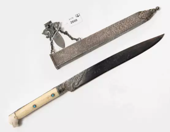 Türkei, osmanisch, 19. Jh. Messergefäss mit Griffschalen aus poliertem Bein mit fünf Türkisen verziert (einer fehlt). Seitenblech und Griffzwinge aus floral verziertem Silber. Etwas verputzte Damast-Rückenklinge (L 18,2 cm) mit leichter Innenkrümmung und floral gravierter Silbermanschette am Ansatz. Fein floral gravierte Silberscheide mit zwei Tragringen, Tragkettchen und einem Traghaken aus SIlber. L 28,8 cm.