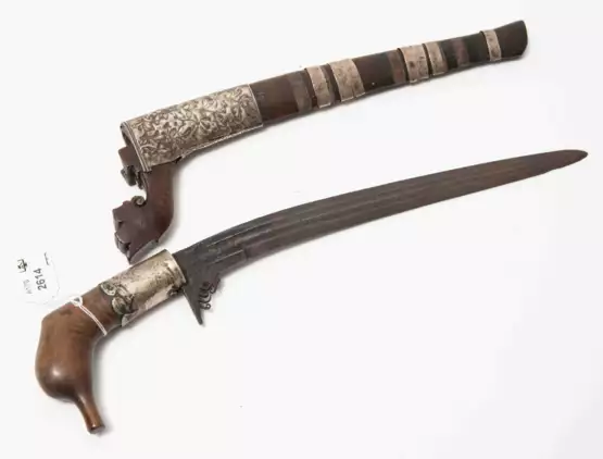 Indonesien, Westsumatra, Aceh. In der Art eines Vogelkopfs beschnitztes Griffstück mit silberner Griffzwinge. Dunkel patinierte Rückenklinge (L 22,5 cm) mit 19,7 cm langer Rückenschneide. Fein gearbeitete Holzscheide mit teils floral getriebenen Silberbeschlägen. L 30,5 cm.