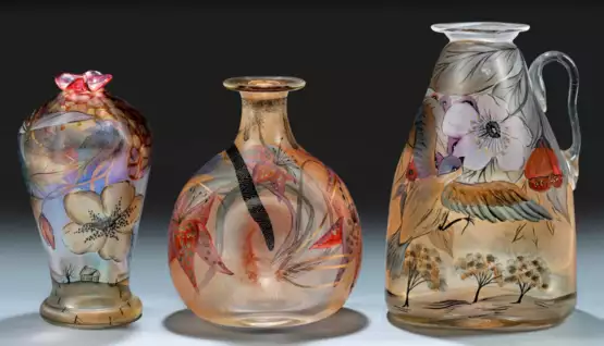 Zwei Flaschen- und eine Ovalvase. Farbloses Glas, Überfänge in Pastellfarben und Gold mit Tier-, Natur- und Kulturlandschaften, teilw. leicht irisierend. Jeweils Sign. "Eisch", dat. "90" bzw. "91", jeweils monogr. "W.L.", "S.G." und "C.S.". H. 20,5 cm - 24,5 cm.