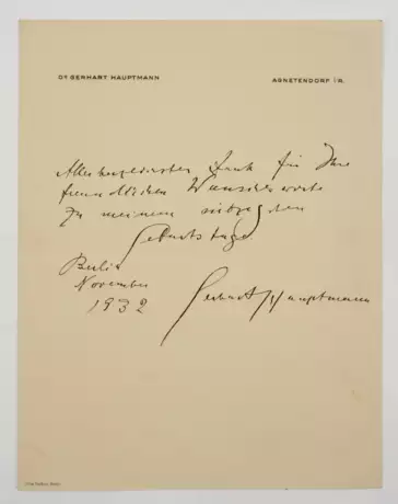 Eigenhändiger Brief mit Unterschrift, 1932; maschinenschriftlicher Brief mit Unterschrift und stempelentwerteter Umschlag, 1939; maschinenschriftliche Karte mit eigenhändigem Zusatz, Unterschrift und stempelentw. Umschlag, 1941; Visitenkarte Benvenuto Hauptmann (4. Sohn G. Hauptmanns), italienische Adressangabe von fremder Hand mit Tinte; 1 stempelentw. Umschlag o. Schreiben. Beigegeben: 2 neuzeitliche Kopien Brief und Karte Hauptmanns. Maße versch., H. 7-21,5 cm. Minim. Alters- und Gebrauchsspuren, Knickspuren.