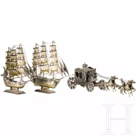 Silber. Zwei Schiffe mit jeweils drei Segelmasten und eine Kutsche mit Viergespann. Pferdegespann beweglich. Alle Teile punziert mit Silberstandard, Steuermarke und Beschaumarke "B" bzw "C". Maße der Schiffe 12 x 13 cm bzw. 13 x 15 cm, der Kutsche 5,8 x 20 cm, Gesamtgewicht aller drei Teile 520 g.