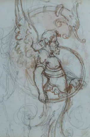 a) Michelangelo, Morgenröte (Aurora). Verso Kohleskizze mit Figurenstudie. - b) Geflügelter Lurenbläser mit Lure mit Drachenkopf als Groteske. Verso Venus von Milo, Bleistiftzeichnung. - c) Zwei Soldaten. Weitere Bleistiftstudien. - Tls. lichtrandig u. etw. stockfl.