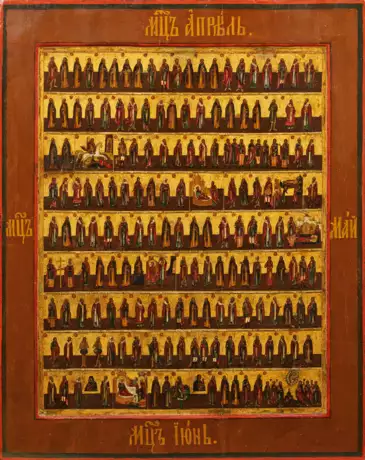 Tempera mit Goldgrund auf Holz. Kowtscheg. Zwei rücks. Sponki. In neun Reihen zahlreiche Darstellungen der Heiligen, Namenspatronen und Festtagen der Monate April, Mai und Juni. Kirchenslawisch bez.; 70,5 cm x 56,5 cm x 3 cm.