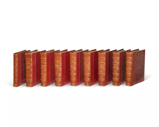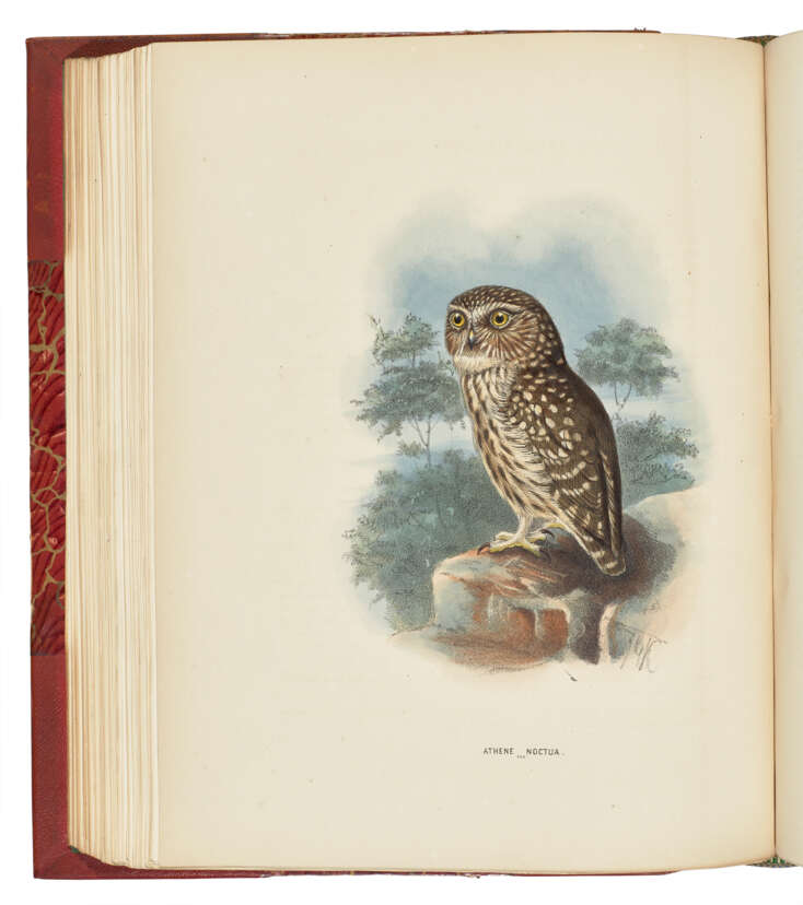 9 volumes including index (volume I) and supplement (volume IX), large quarto (324 x 252mm). 8 lithographic titles (of 9, without lithographic title to vol. IX), 722 lithographic plates (collating as per the usual bibliographies but without plate 599a found in some copies), all but two, pl. 263 and pl. 485, hand-coloured, extra-illustrated with a manuscript sketch map of Europe tipped in at the beginning of vol. II and with 3 additional plates, viz 253a Siberian Jay Perisoreus infaustus in vol. I being an example of a hand-coloured ‘rejected’ plate, 302a Barn Owl Strix flammea in vol. V from Rowley’s Ornithological Miscellany hand-coloured with superior detailing of feathers, and 509a Little Bustard Otis tetrax in vol. VII which is an uncoloured duplicate ‘inferior plate,’ plate 120 in vol. II with printed overslip correcting caption, plates in supplement with printed numbers, the others unnumbered but with pencil numeration throughout on blank rectoes, and text similarly paginated (chip and small marginal repair to fore-edge of text leaf pp.13-14 in vol. II, a couple of tiny insignificant marginal nicks and tear, occasional faint insignificant spotting but otherwise, a clean fresh set). Early 20th-century red half roan over marbled-paper covered boards, spines with raised bands in 6 compartments, extensively lettered in gilt listing species contained in each volume, top edges gilt, the others uncut, vol. I preserving original blue paper wrappers to parts (extremities lightly rubbed, joints more heavily). Provenance: Lord Garioch, Earl of Mar (bookplates dated 1913).
