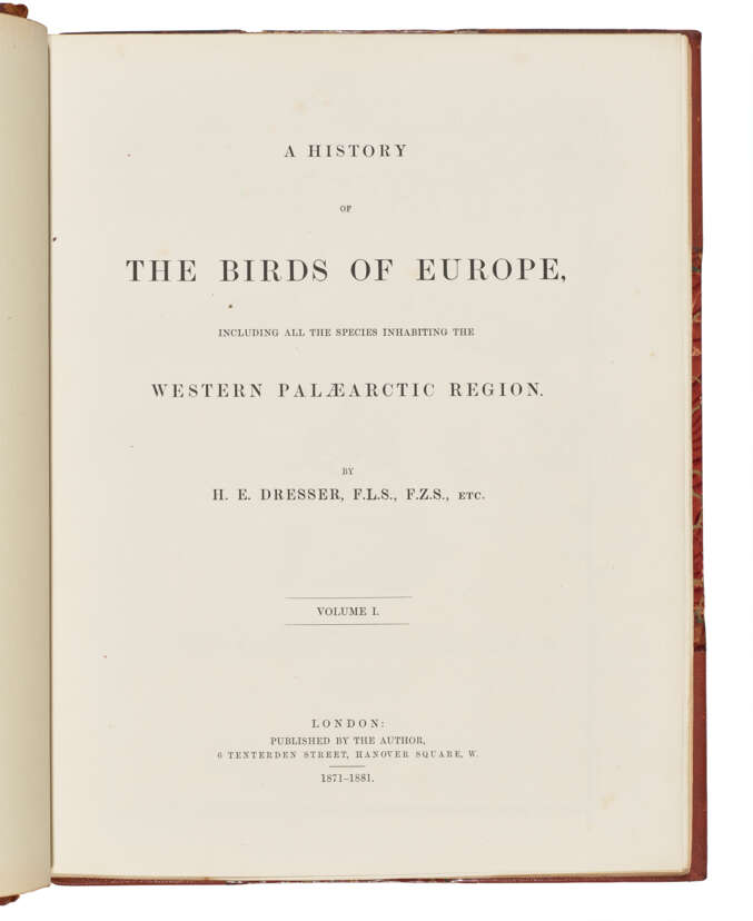 An extremely handsome set of the first edition, based by the author on his collection of 12,000 bird skins. Originally published in 84 parts between 1871 and 1882, a further 9 supplementary parts appeared between 1895 and 1896, which are complete in this set. At the outset, Dresser collaborated on The History of the Birds of Europe with noted ornithologist Richard Bowdler Sharpe, and the first few parts were issued in their joint name. On Sharpe’s appointment to the British Museum (Natural History), where he ultimately became the curator of the bird collection, Dresser took on the task of completing the work himself. Dresser was elected as a member to the British Ornithologists’ Union in 1865, and served as the secretary of the Union from 1882-1888. He authored over 100 scientific papers on birds, many of which described new species and illustrated the eggs of many species of birds for the first time. Anker 120; Fine Bird Books (1990) p.72; Nissen IVB 267; Zimmer p.177.
