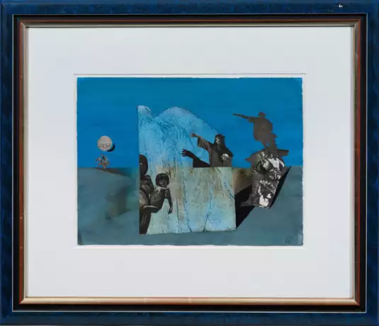 Schlotter, der an der Münchner Akademie studierte, reiste ab 1986 mehrfach in zugängliche Amazonasgebiete und hielt seine Eindrücke in zahlreichen Zeichnungen, Druckgrafiken und Collagen fest, wobei sein Fokus stets auf den Ureinwohnern des Regenwaldes lag. 1988 schuf er eine Serie von Collagen, in denen er sich kritisch mit dem Verhältnis des Menschen zum Urwald als Lebensraum und Rohstofflieferant auseinandersetzte. Mischtechnik mit Collage/Bütten. R .u. monogr. (in Kreis). Verso von fremder Hand bez. und betitelt. Blatt 27,5 cm x 37,8 cm. Rahmen.