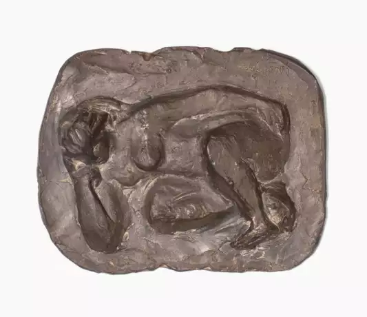 Frauenakt. Bronzerelief. Oben rechts signiert. 14x16,5 cm.