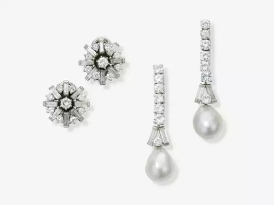 Drop earrings: 750 white gold, hallmarked; stud earrings: 585 white gold, hallmarked. Drop earrings: 14 brilliant-cut diamonds totalling approx. 2.42 ct. and 4 trapeze-cut diamonds, stud earrings: 18 brilliant-cut diamonds and 16 baguette-cut diamonds. The pieces of jewellery are in good condition. Ca. 10.5 g (drop earrings); ca. 9.6 g (stud earrings). Totalling ca. 20.1 g.