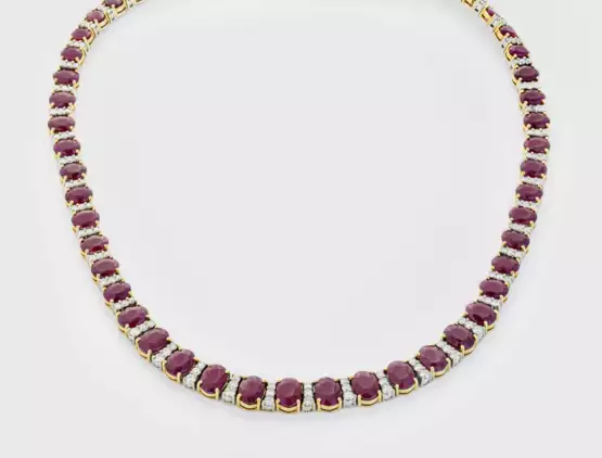 Gelb- und Weißgold, 18 k mit französischem Goldstempel. Schauseitig besetzt mit tiefroten Burma-Rubinen von zus. 55,00 ct. in Krappenfassung, unterteilt durch Brillanten von zus. ca. 5,00 ct. (G/vvs1). L. ca. 42 cm. Gew. ca. 53,4 g.