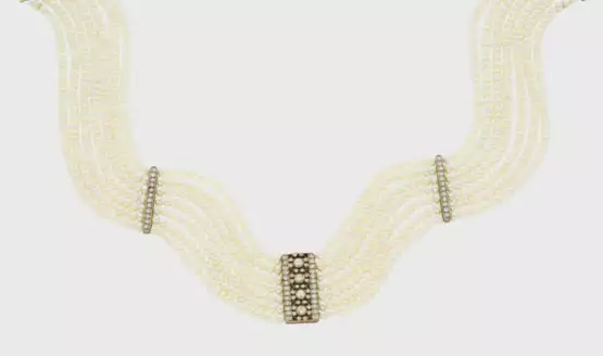 Weißgold, gest. 585. 7-reihige Kette aus schneeweißen Zuchtperlen von ca. 3 mm in sehr feinem, rosé-grün changierendem Lüster. Mittig florale Reserve in Ajour, ausgefasst mit kleinen Diamanten, korrespondierende Schließe. L. ca. 34,5 cm. Gew. ca. 47,68 g.
