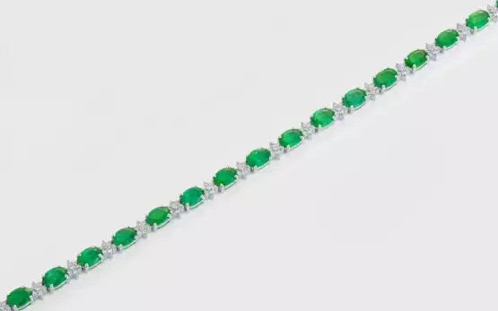 Weißgold, gest. 750. Linear besetzt mit leuchtendgrünen Smaragden von zus. ca. 14,60 ct., unterteilt durch Diamanten von zus. ca. 1,66 ct.; L. 18,5 cm. Gew. ca. 16,94 g.