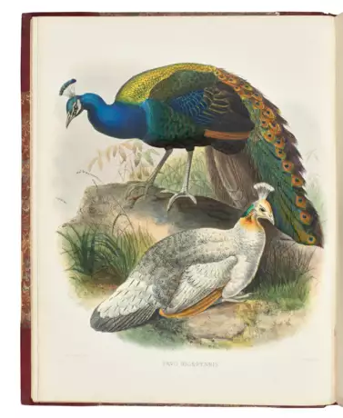 Issued in 6 parts between June 1870 and October 1872, the large size of the plates allied with the meticulous way in which they are coloured, gives them a magnificence which reflects the importance which Elliot attached to the Phasianidae. Of all the families in the ornithological system, he regarded it as the one most vital to the human race, 'containing within it the species that afford food for thousands of mankind, and also those which are the original source of all the domestic poultry met with throughout the civilized world.' He generously dedicated the work 'To my friend Joseph Wolf... whose unrivalled talent has graced this work with its chief attraction, and whose marvellous power of delineating animal life renders him unequalled in our time'. Anker 130; Fine Bird Books (1990) p.95; Nissen IVB 295; Wood p. 331; Zimmer p. 206.