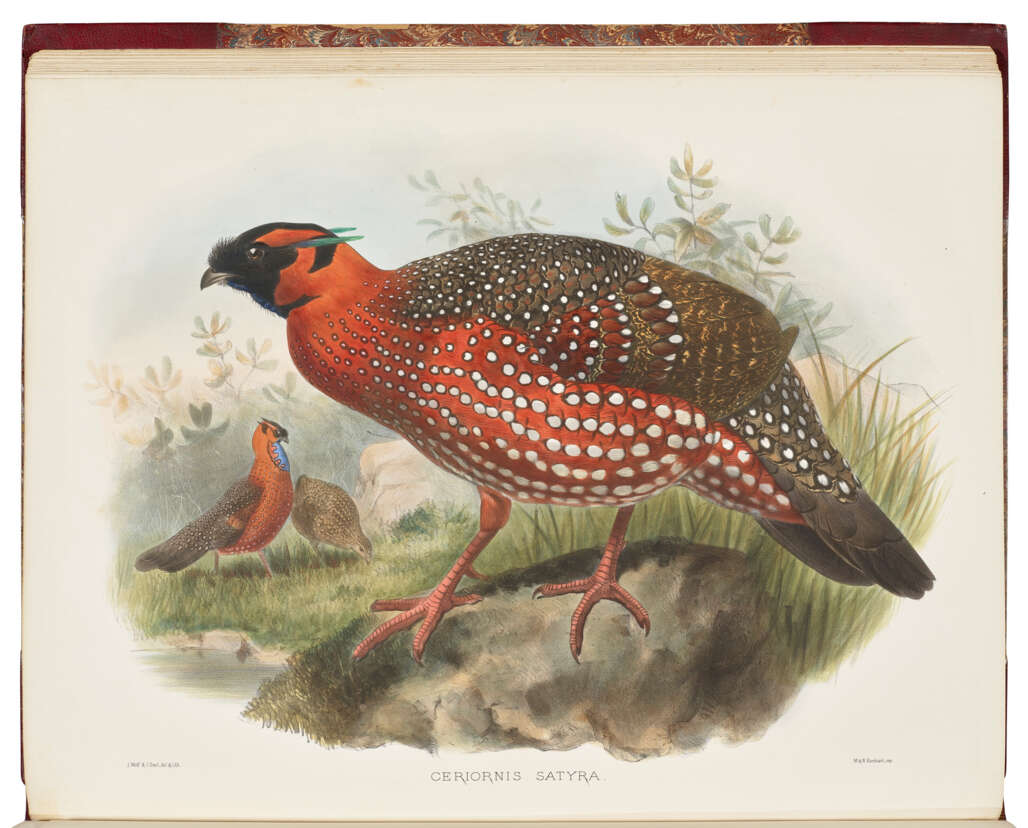 2 volumes, broadsheet folio (620 x 480mm). 2pp. list of subscribers (listing 115 names subscribing for 119 copies). 79 fine hand-coloured lithographic plates, 1 folding; after Joseph Wolf by J. Smit and J.G. Keulemans, printed by M. and N. Hanhart and P.W.M. Trap, coloured by J. D. White, 2 uncoloured plates of generic characteristics, on india paper mounted, by and after Smit (blank prelim in vol. I with light diagonal creasing, occasional faint scattered spotting mostly affecting text leaves, text leaves to Euplocamus pyronotus and Calophasis ellioti in vol. 2 lightly creased). Contemporary red half morocco over marbled-paper covered boards, gilt spines with raised bands in 6 compartments, lettered in second and fourth, the others with triple gilt fillets inclosing cornerpieces composed of very small flower heads, rosettes and scroll tools, top edges gilt, others uncut, preserving original wrappers bound in at end of vol. 2 (extremities rubbed, raised bands and corners more heavily). Provenance: Iveagh (small ink stamps dated 1894 on front prelims in both vols).