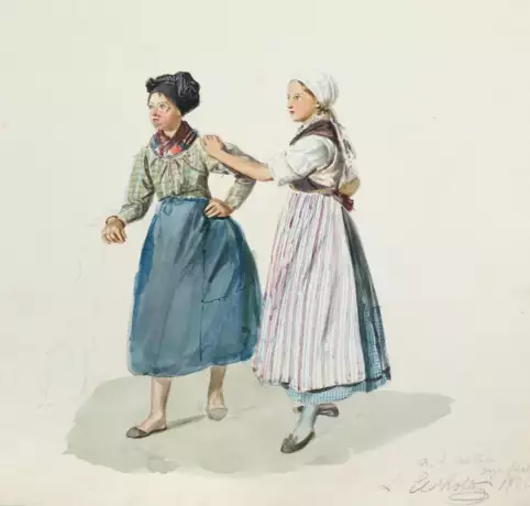 (1805 Berlin 1850). Zwei Frauen in Tracht. Aquarell mit einigen Deckweißlichtern über Bleistift auf Velin, 1835. 21,4 x 22,1 cm. Re. unten bez., sign. u. dat.