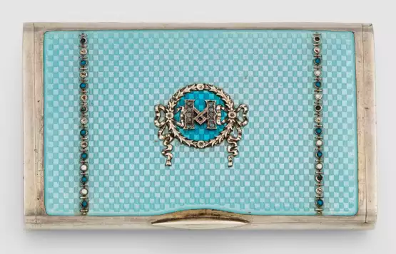 im Stil von Karl Fabergé. Silber, teilw. emailliert. Rechteckiger Korpus, Ober- und Unterseite kariert guillochiert und hellblau emailliert. Der flache Scharnierdeckel mit zentralem mit Diamantrosen besetzten Monogramm "M" in schleifenverziertem Lorbeerkranz. Mit Etui. Gest. Sterling, Modellnr. 338. Gew. ca. 155 g. H 1 cm. 5,5 cm x 8,5 cm.