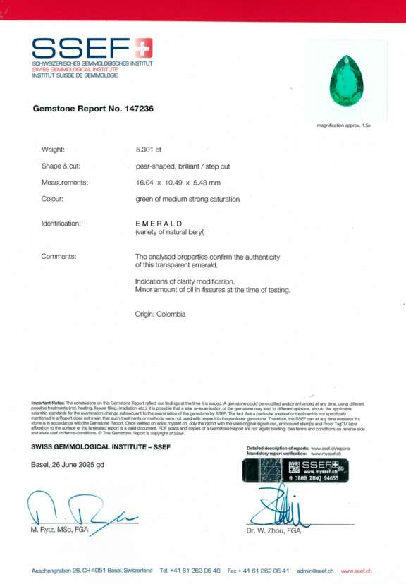 SSEF, 2025, report no. 147236: 5.301 carats, Colombia, indications of clarity modification, minor oil in fissures