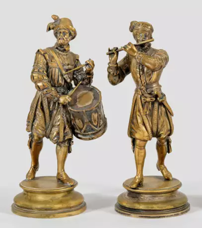 A pair of bronze figures depicting Renaissance musicians. Each signed.