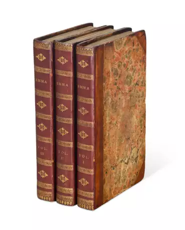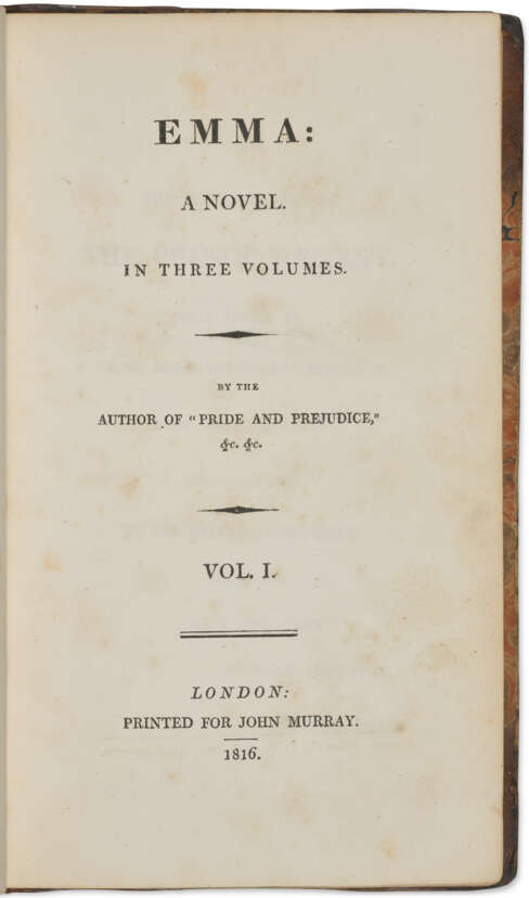 First edition of the last of Austen’s works to be published during her lifetime, with a contemporary binding and Cooper-Powys family provenance. Austen began writing Emma on 21 January 1814 and finished in little over a year on 29 March 1815. Whereas each of her previous novels had been first published by Thomas Egerton, Emma was taken up by John Murray, a powerhouse in literary publishing whose clients included Lord Byron. The novel was published at her own expense in late December 1815 (the title being dated 1816), with profits going to Austen after payment of a 10 percent commission to the publisher. It was dedicated to the Prince Regent at the suggestion of the Prince's librarian.
