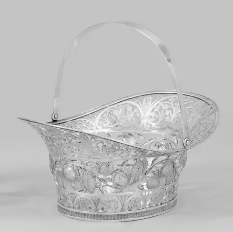 Silber. Auf ovalem Stand zum Rand ausschwingende, durchbrochen gearbeitete Wandung mit Palmetten, C-Schwüngen und floralem Dekor. Glatter Spiegel. Übergreifender, beweglicher Henkel graviert mit Laub und Beeren. Gest. 13 Lot, Tremolierstrich, Beschauzeichen, Meister Johann Conrad Lauck (gest. 1826). Gew. ca. 685 g. Ges.-H. 23 cm. 29,5 cm x 23 cm.