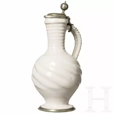 Fayence. Auf rundem Fuß mit Zinnmontur. Kugeliger, schräg gerippter Korpus. Schlanker, horizontal gerippter Hals mit abgesetzter Mündung. Zinndeckel mit Marke. Zopfhenkel. Montur mit Riss. Mündung mit Bestoßung und Abplatzer. Kleine Glasurabplatzer. Höhe: 34 cm