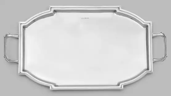 Sterlingsilber. Rechteckige Grundform mit eingezogenen, gerundeten Ecken und korrespondierenden, seitlichen Griffen. Glatter Spiegel, leicht ausschwingende, mehrfach profilierte Fahne. Gest. Beschaumarken, Herstellerzeichen, Jahresbuchstabe "q". Gew. ca. 1110 g. 26,5 cm x 48 cm.