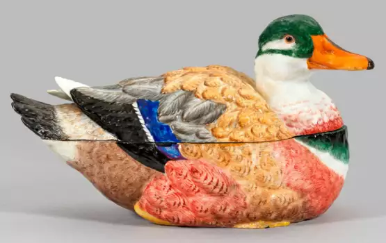 Derartige Geschirre in Tiergestalt dienten der Dekoration auf festlichen Tafeln bei Hofe und zudem der Darbietung besonderer Speisen, die beim Öffnen einen Überraschungseffekt am Tisch erzielen sollten. Der Modelleur Johann Friedrich Lück begann 1741 als Lehrling in der Meißener Manufaktur, ging später nach Höchst und Frankenthal und war 1764 nach Beendigung des Krieges wieder in Meissen tätig. Um die Mitte des 18. Jhs. entwarf Kaendler bereits eine Ententerrine solcherart.