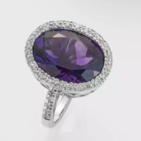 Weißgold, gest. 585. Zentral besetzt mit einem tiefvioletten Amethyst von ca. 15 x 11 x 10 mm, entouriert von kleinen Diamanten. Gew. 7,76 g.