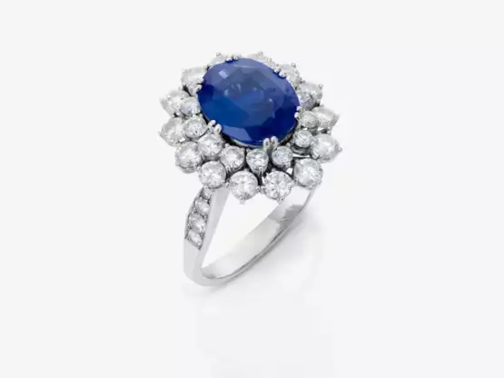 Platinum, hallmarked and 950/-, engraved. Approx. 36 brilliant-cut diamonds totalling approx. 3 ct. 1 oval facet-cut sapphire of approx. 4.15 ct. The ring is in very good condition and shows only minor signs of wear and tear consistent with its age. Ringsize: 54. Ca. 10.8 g.