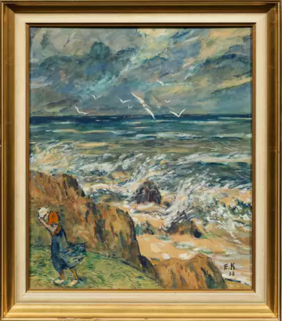 Stimmungsvolle, expressionistisch angelegte Küstenimpression, in der eine Frau links außen gegen den Sturmwind ankämpft. Klauck, der von "Brücke"-Malern wie Erich Heckel und Karl Schmidt-Rottluff beeinflusst war und ab 1925 in der Künstlerkolonie Nidden die Expressionisten Ernst Mollenhauer und Otto Beyer kennenlernte, wurde nach dem Zweiten Weltkrieg um 1950 im Dorf Hüde am Dümmer ansässig, wo er bis 1970/71 lebte und arbeitete. Gouache über Kreide/Papier, kaschiert auf Holzplatte. R. u. monogr. und dat. (19)38. Ca. 59,5 cm x 50 cm. Rahmen.