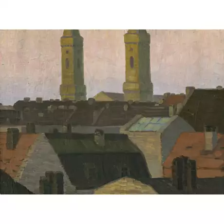 Estate stamp verso. Old paper label on the stretcher, titled there. Oil on canvas. 60 x 80 cm. Craquelure. Framed (65 x 85 cm).