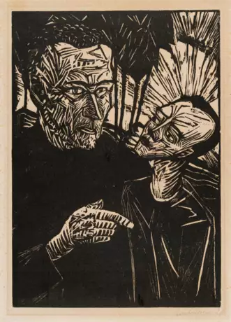Erich Heckel greift für den Holzschnitt das Motiv seines 1917 entstandenen, gleichnamigen Gemäldes „Der Spaziergang“ erneut auf (vgl. Hüneke 1917-12). Er verwendet es in abgewandelter Form nochmals 1922/23 auf der Hauptwand im Erfurter Wandbildzyklus. Das Sujet nimmt Bezug auf eine Szene aus dem Anfang des Romans „Titan“ von Jean Paul mit dem jungen Albano und seinem Vater Don Gaspard. Die Darstellung ist drüber hinaus symbolhaft zu deuten: Der Ältere weist dem Jüngeren den Lebensweg.