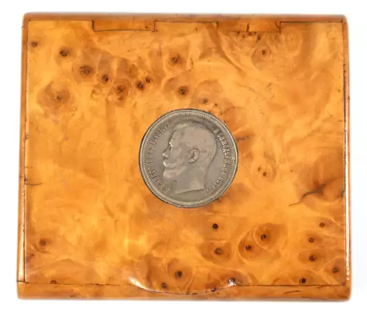 Лот 589 | Etui, karelische Maserbirke, im Scharnierdeckel Münze "Nikolai II, 1896", 1,5x9,2x8,1 cm