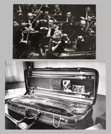 2 Fotografien "Violinenkoffer David Oistrach" / "Orchester mit Pianistin"