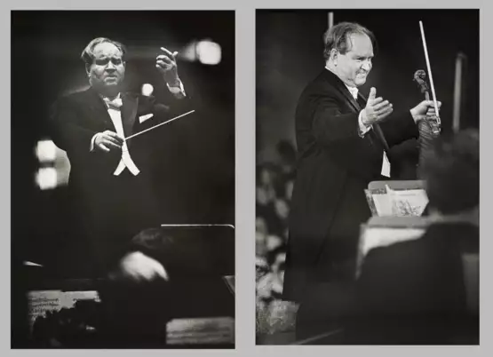 Silbergelatine-Abzüge auf Barytpapier. 1 Fotografie rücks. Copyright-Stempel Evelyn Richter VDJ/C. Wilhelmi Stuttgart von fremder Hand betitelt: „David Oistrach“ und beziffert 95. (Seitenangabe für die Platzierung innerhalb der Monografie „David Oistrach - ein Arbeitsporträt, Berlin, 1973); 2. Fotografie nicht im Buch verwendet, rücks. ohne Angaben. Ausdrucksstarke, authentische Porträts des sowjetischen Violinisten und Dirigenten David Oistrach (1908-1974), die für das umfangreiche, 1973 erschienene Fotobuch zu Oistrachs Schaffen entstanden. Fotografie ca. 29,3 cm x 19,8 cm. Minim. Alters- und Gebrauchsspuren, minim. Randläsuren.