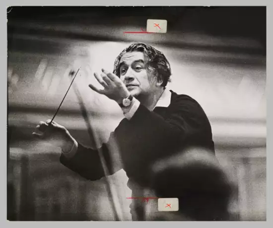 Silbergelatine-Abzug auf Barytpapier. Vorderseitig Aufkleber und Größenmarkierungen mit Rotstift. Rücks. mit Bleistift sowie in Rotstift bez. „Celibidache“, dat. 19.5.1976. Copyright-Stempel Evelyn Richter VDJ/C. Wilhelmi Stuttgart. Reste Etikett „Abendze..ung“. Lebendiges, authentisches Porträt des rumänischen Dirigenten Sergiu Celibidache (1912-1996) während einer Orchesterprobe in der Kongresshalle Leipzig 1966. Fotografie ca. 21 cm x 25,4 cm. Minim. Alters- und Gebrauchsspuren, Knicke, Randläsuren.