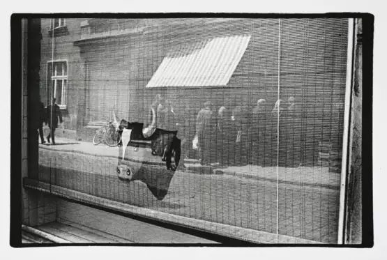 Silbergelatine-Abzug auf Barytpapier. Rücks. Copyright-Stempel Evelyn Richter VDJ Leipzig, Rücks. Versch. Bleistift-Bezifferungen. Eindrückliche, symbolhafte Darstellung der prekären Versorgungslage der Bevölkerung in der DDR. Fotografie ca. 19,8 cm x 30,7 cm/Blattgröße 30 cm x 40,5 cm. Minim. Alters- und Gebrauchsspuren.