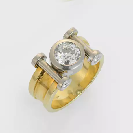 Gelbgold, gest. 750. Breite, profilierte Ringschiene akzentuiert durch 4 Brillanten von zus. ca. 0,30 ct. (H/vsi), mittig eingesetzter Altschliffdiamant von ca. 1,93 ct. (J/si). Gew. ca. 19,99 g.