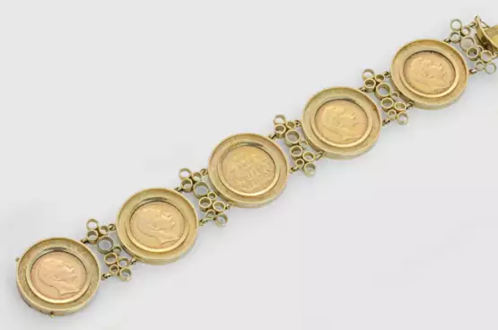 Armband in Gelbgold, gest. 585. Besetzt mit sechs 20-DM-Dukaten-Münzen mit erhabenen Porträts im Profil von Kaiser Wilhelm II., Kaiser Friedrich III. und König Wilhelm II. von Württemberg, aus den Jahren 1888, 1890, 1905, 1906 und 1910. L. ca. 20,5 cm. Gew. ca. 109,54 g.